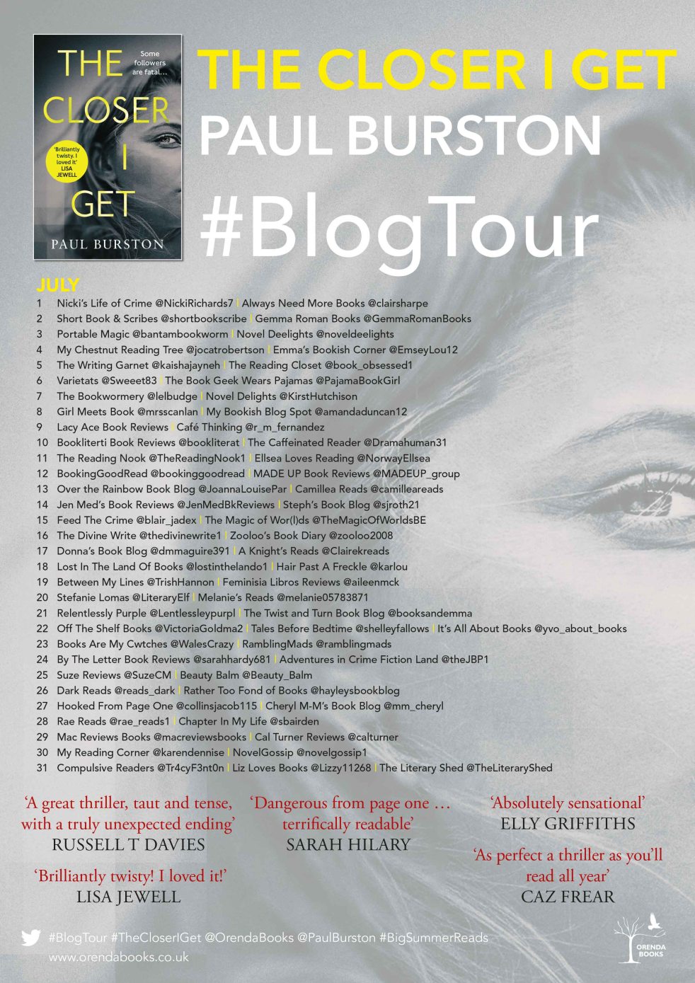 Ready to discover another great book for this 2019? Take a look… The Closer I Get by Paul Burston Genre: Psychological Thriller Source: Random Things Tours Amazon About The Book Tom is a successful author, but for the first time in his life, he has writer ’s block. His main distraction is an online admirer,… Continue reading The Closer I Get by Paul Burston – Blog Tour
