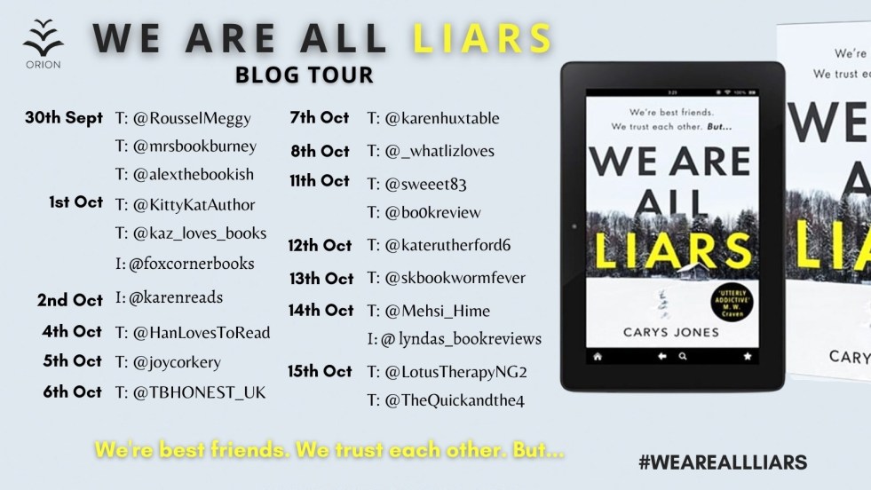 Ready to discover another great book for this 2021? Take a look… We Are All Liars by Carys Jones Genre: Psychological ThrillerRating: 4/5Publisher: Orion DashAmazon, Hive About The Book We're best friends.We trust each other.But…We are all liars.Allie, Stacie, Diana, Emily and Gail have been by each other's sides for as long as they can remember. The Fierce Five. Best friends… Continue reading We Are All Liars by Carys Jones – Blog Tour