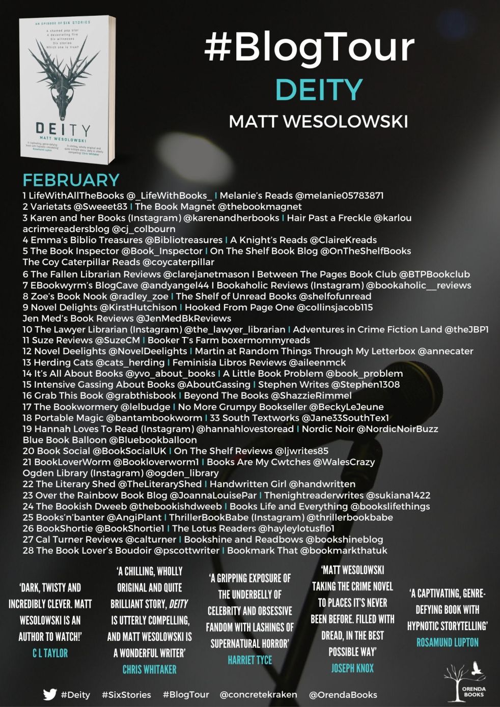 Ready to discover another great book for this 2021? Take a look… Deity by Matt Wesolowski Genre: Psychological ThrillerSource: Random Things ToursRating: 5/5Publisher: Orenda BooksAmazon, Hive About The Book When pop megastar Zach Crystal dies in a fire at his remote mansion, his mysterious demise rips open the bitter divide between those who adored his music and his endless charity work, and… Continue reading Deity by Matt Wesolowski – Blog Tour